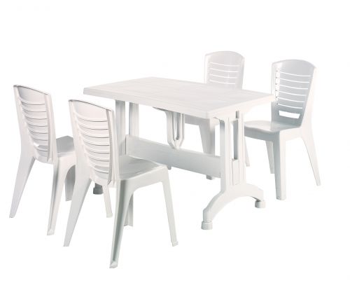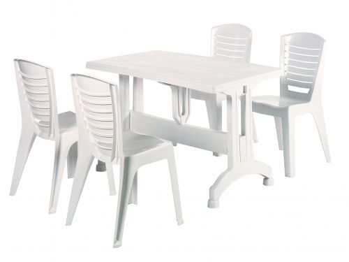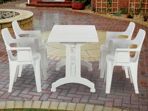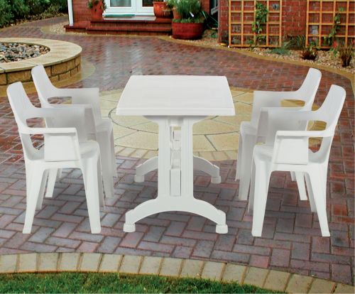 Polypropylene top table comes with plastic leg leg. Easy to assemble/disassemble. Durable, weather resistant. Suitable for indoor and outdoor use. Enjoy your garden.