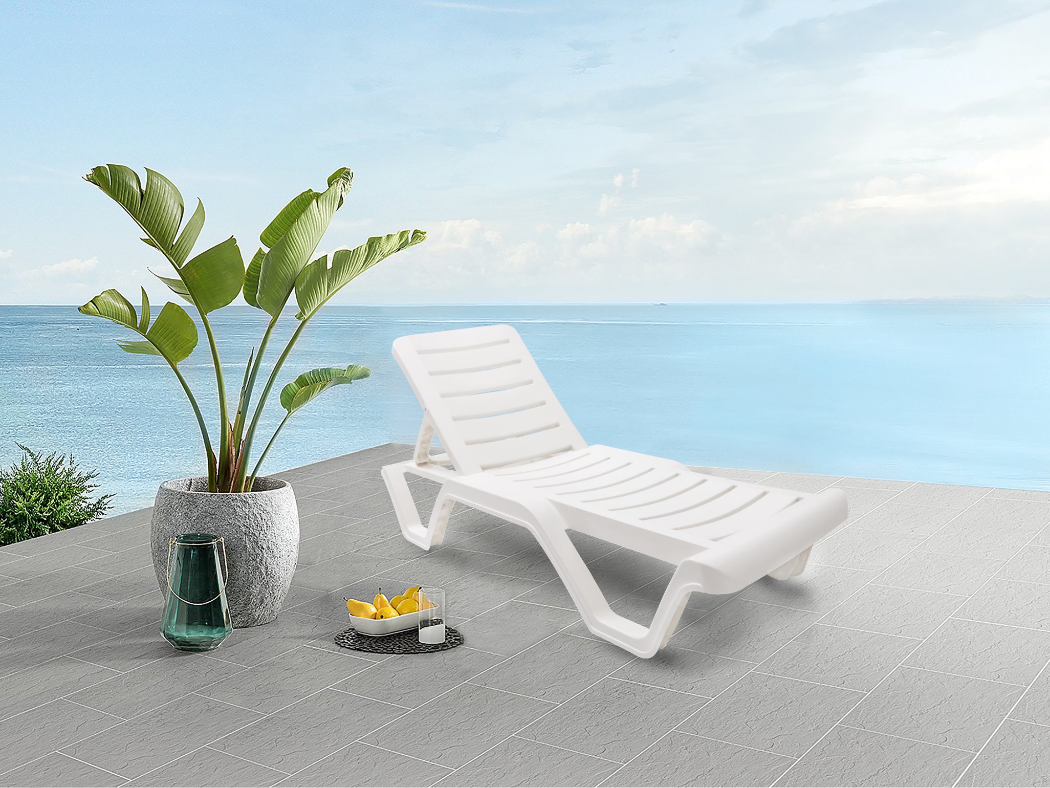 Lara sun lounger without arm is produced by polypropylene. It is durable weather resistant also includes UV and AO additives which insures the color will not fade. It is back reclines in four positions with non-slip feets also hidden wheels for easy carry.